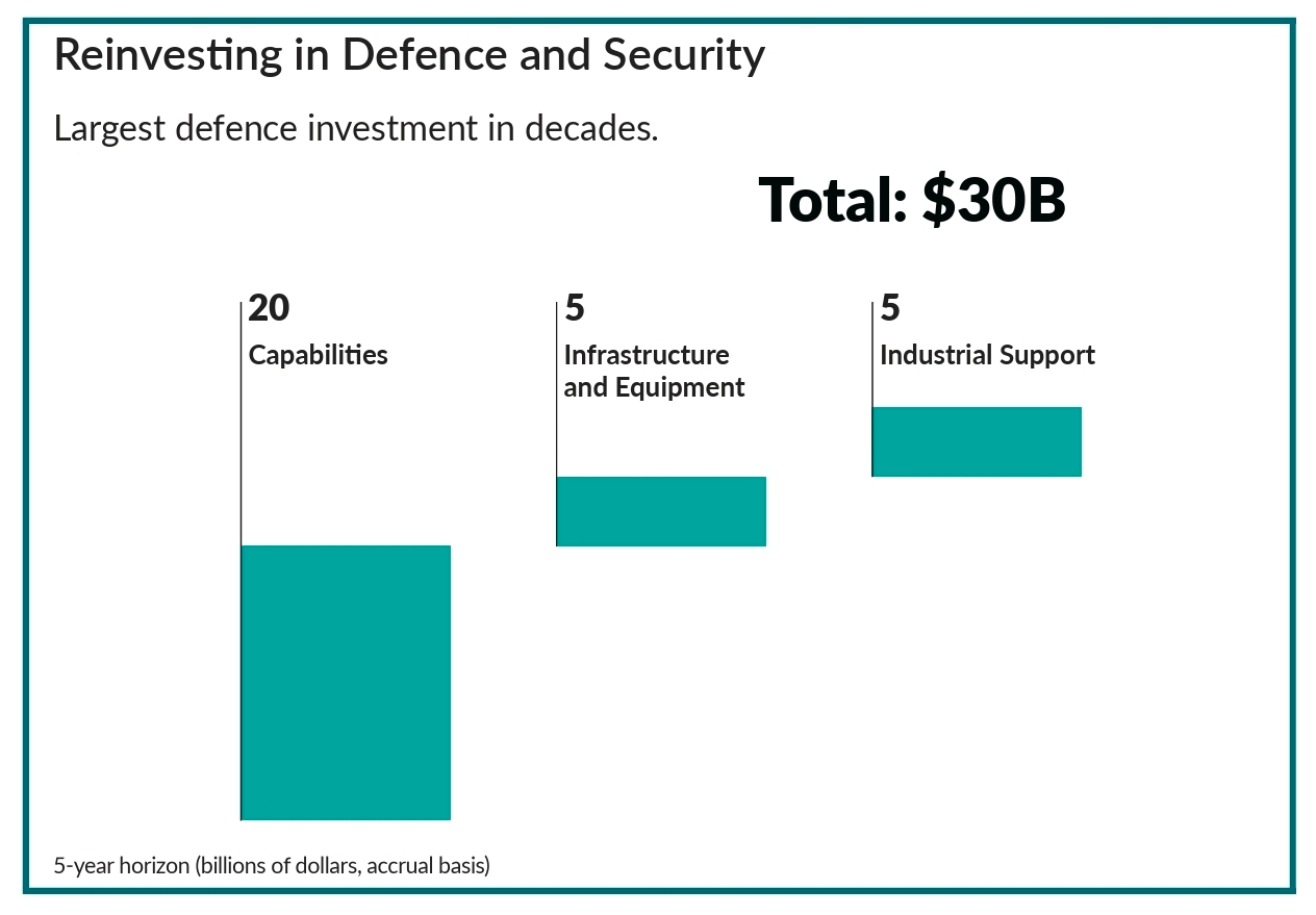This reinvestment in defence and security is the largest in decades, totaling $30 billion over a five-year horizon on an accrual basis. This funding is allocated across three main pillars: $20 billion for capabilities, $5 billion for infrastructure and equipment, and $5 billion for industrial support.