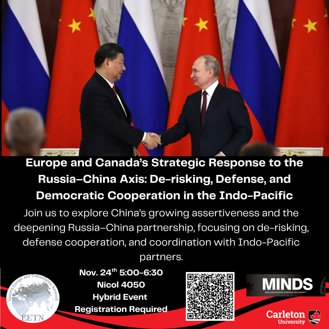 Carleton University’s Eastern European and Transatlantic Network (EETN) is hosting an important upcoming event exploring how Europe and Canada are responding to the growing Russia–China partnership. The event, titled “Europe and Canada’s Strategic Response to the Russia–China Axis: De-risking, Defence, and Democratic Cooperation in the Indo-Pacific,” will take place on Monday, November 24, 2025, from 5:00 p.m. to 6:30 p.m.