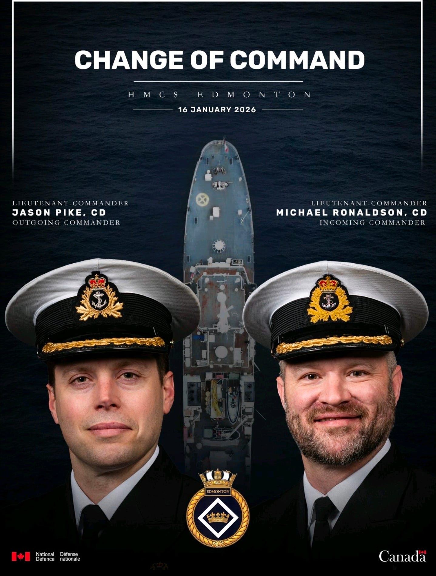 “Today, HMCS Edmonton held a Change of Command ceremony, where Lieutenant-Commander Jason Pike officially transferred command to Lieutenant-Commander Michael Ronaldson. The ceremony was presided over by Commodore Jacob French, Commander of Canadian Fleet Atlantic (CANFLTLANT).