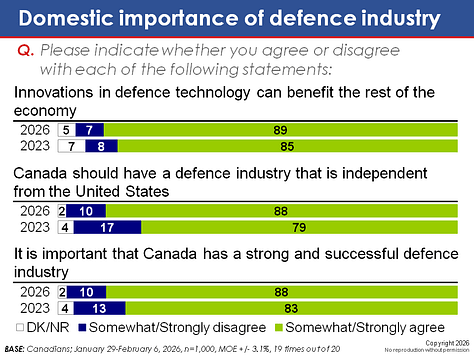 Crucially, this support is tied to how defence dollars are spent. Our last poll showed a strong preference for linking defence to national projects and investments. Canadians increasingly view defence as a driver of economic growth and innovation. There is a near-consensus that a strong defence industry is an economic necessity, while a similar proportion believe innovations in defence technology can deliver spillover benefits across the broader economy.