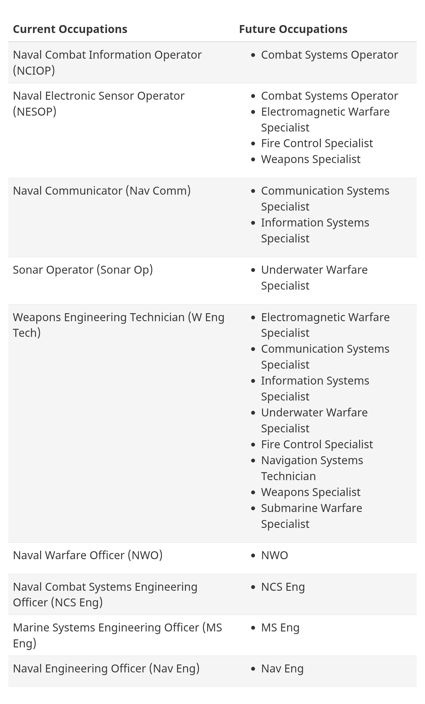The outcome of that analysis was clear. While our people continue to deliver outstanding operational effect, the way our occupations are structured has not kept pace with evolving demands. In December, the OA presented Commander of the RCN with a course of action to transition nine existing RCN-managed occupations into thirteen modernized occupations. This change is designed to better align skills, training, career pathways, and workforce management, and to create a more resilient workforce that can grow alongside new capabilities, such as advanced combat systems and future classes of ships.
