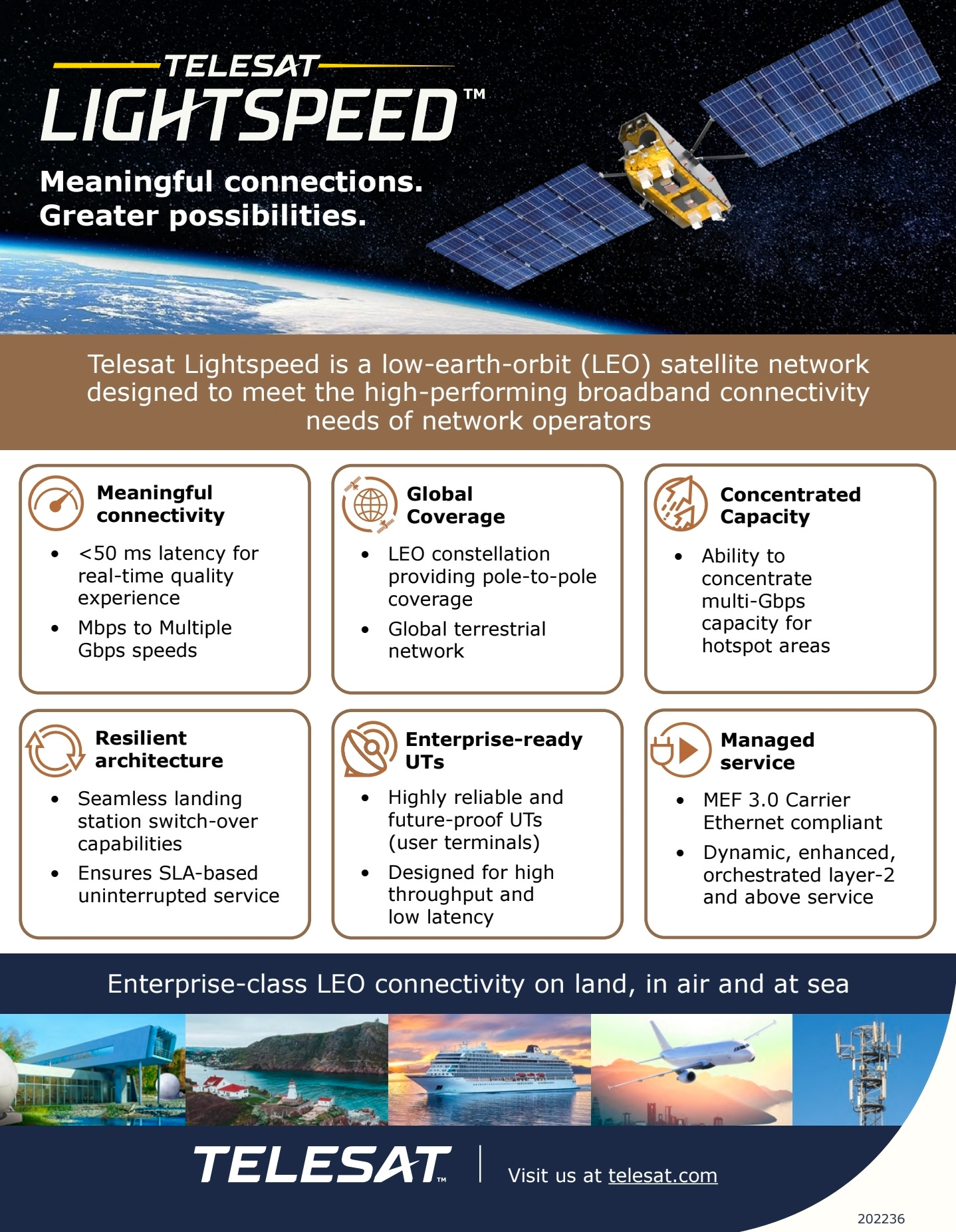 I also don't believe I need to introduce Lightspeed, but for those that don't know, Lightspeed is Telesat's newest enterprise-class, high-throughput LEO constellation. Lightspeed is a fully regenerative space-based mesh network that delivers fiber-like latency and multi-gigabit throughput to any point on Earth, including polar regions, while maintaining MEF 3.0 Carrier Ethernet standards.