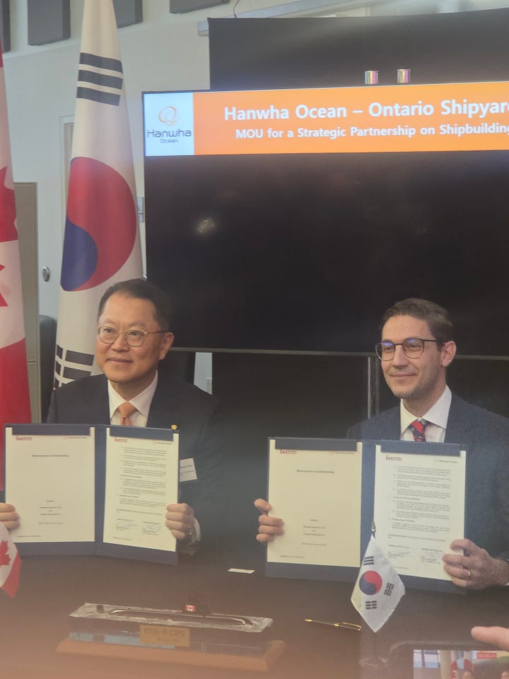 Under the bilateral MOU, Hanwha Ocean will provide structured technical and operational support to Ontario Shipyards to strengthen production readiness and shipyard performance.