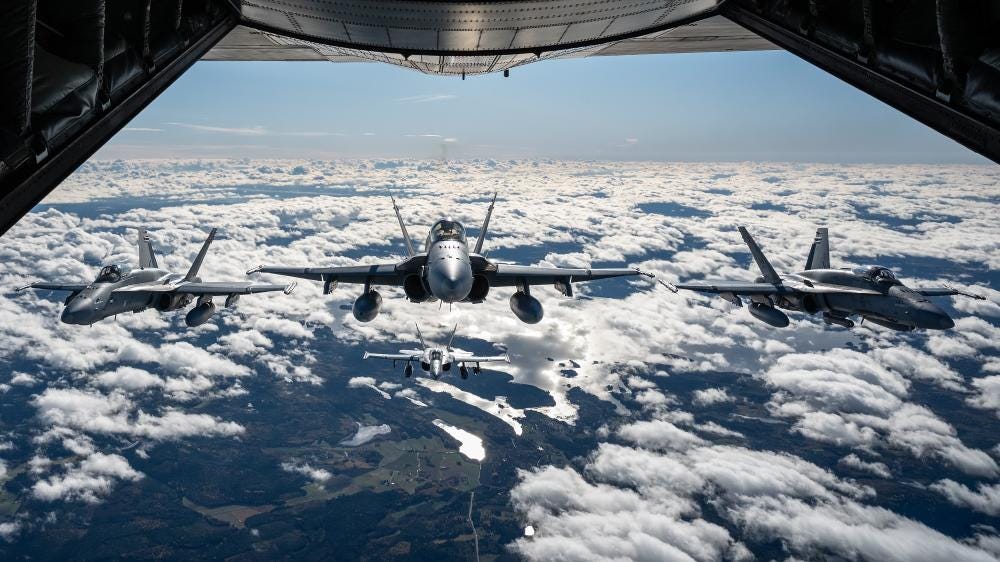 The missions involve Finnish F/A-18 Hornet fighter jets from Karelia Air Wing, and Canadian CF-188 Hornet fighter jets from Ämari Air Base in Estonia. A Canadian CC-130HT Hercules air-to-air refueller supports the jets.