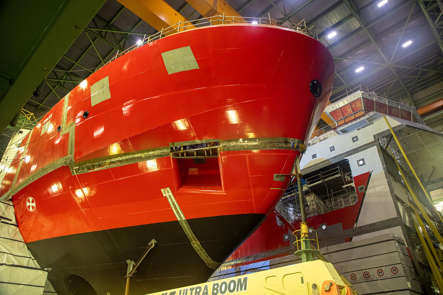 βThe bow mega block for the future CCGS Donjek has taken shape inside the Module Hall at Halifax Shipyard. Over 30 metres in length and comprised of sixteen individual units, the bow mega block will roll out to land level later this month.β