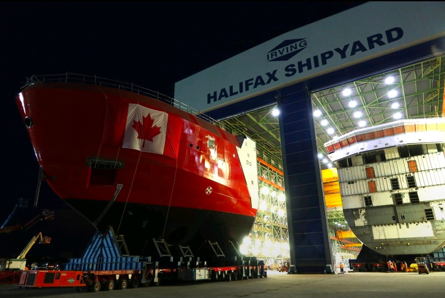 “This week, the grand block and bow mega block of the future CCGS Donjek are rolling out of the Module Hall at Halifax Shipyard. This exciting milestone marks significant progress on the first Arctic and Offshore Patrol Ship built for the Canadian Coast Guard.”