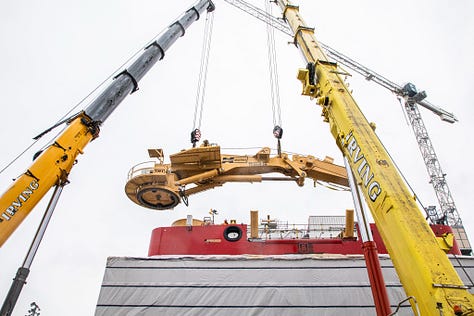 The main crane for AOPS 7 has been lifted and loaded onto the vessel. Designed and built in Chester, NS, this Hawboldt Industries crane weighs approximately 65,000kg and can lift over 20,000kg.