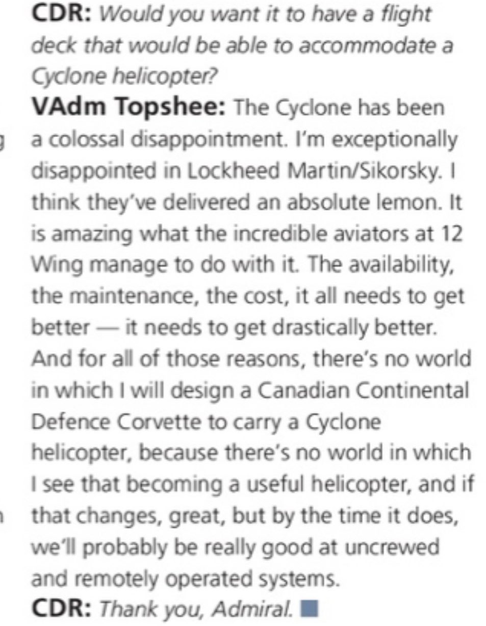 Cyclone isnt a new helicopter. It's a product of 1990s requirements, from a contract signed twenty years ago. It still has yet to reach its final Block 2.1 state. I get why its frustrating to everyone. Im glad Topshee said the quiet part out loud. Call them what they are.