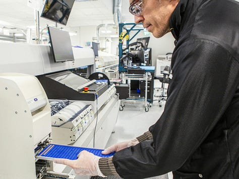 Electronics assembly, integration and testing take place on a production line specially designed in a continuous, sequential flow for optimal efficiency with highly sophisticated automated inspection and test equipment that ensures printed circuit boards (PCB) are free of defects. Thanks to the new, state-of-the art machinery added, it now takes a quarter of the time it once took to assemble and inspect a PCB. When we eventually attain peak production capacity, the output will reach hundreds of finished cards per day.