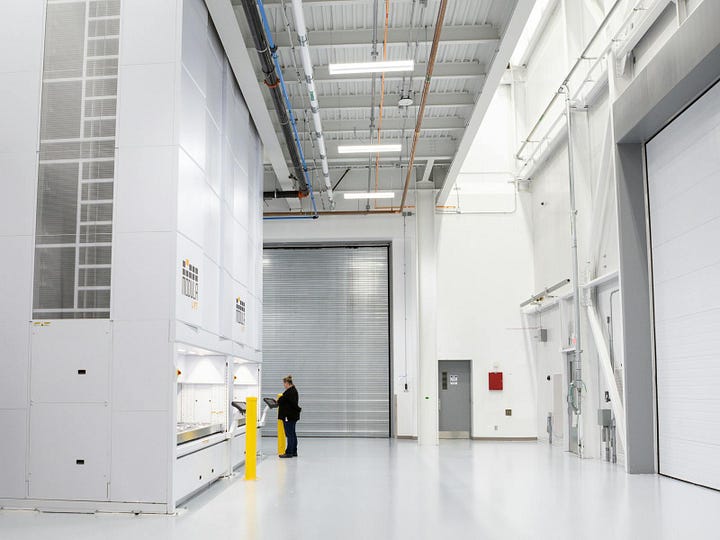 In any manufacturing facility, space is a premium commodity, and with high-volume production comes a high volume of hardware. Towering from the third-floor store to the ground floor, a pair of automated vertical storage units (VLM) with their 75 shelves in a carousel system are a novel solution to a warehousing puzzle. They offer a substantial advantage: a combined 1,126 cubic feet of storage.