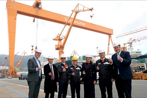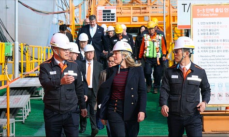 Fresh off the plane, the Minister's first major stop took her right to the thick of things as she stopped by Hanwha's shipyard in Geoje to tour the yard and get a first-hand look at the ROKS Jang Yeong-sil, the first of the KSS-III Batch II submarines to be launched.