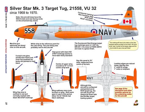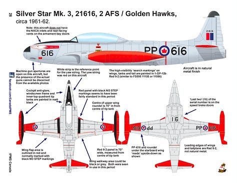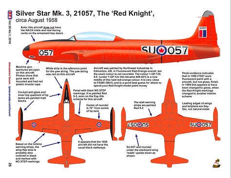 Infographic showcasing the CT-133 Silver Star in several distinct historical Canadian military paint schemes, including the vibrant Red Knight display, the Golden Hawks, and a Royal Canadian Navy target tug. Originally published by the International Plastic Modellers' Society (IPMS) of Canada.