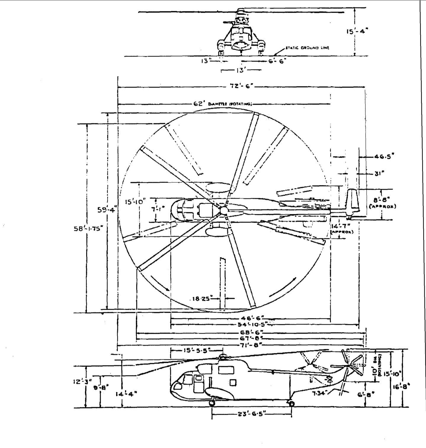 Three-view schematic of a Sikorsky Sea King helicopter, detailing precise dimensional measurements across front, top, and side profiles. Finding Sea King stuff can be surprisingly difficult.