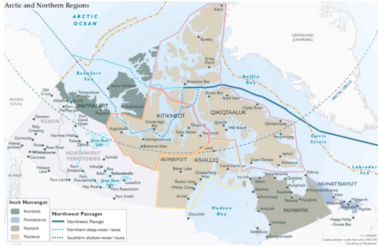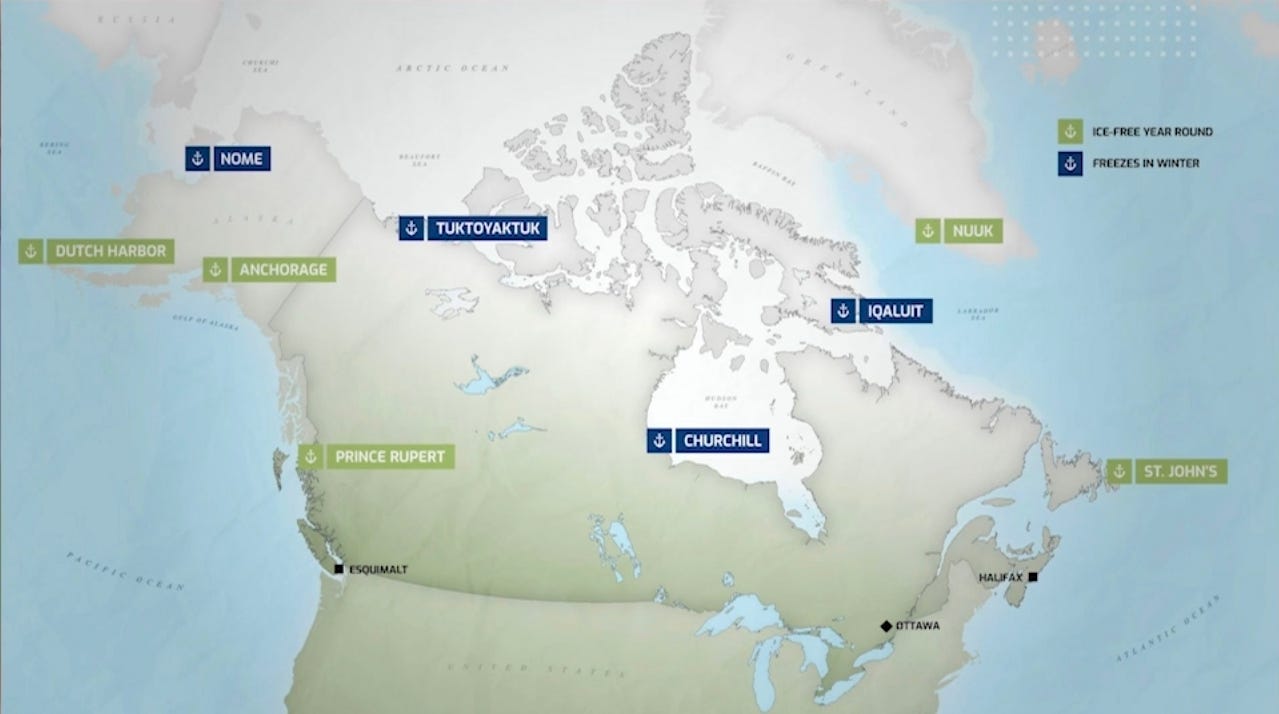 A map showcasing the various major ports in North America along with their Ice Status. A good representation of the laxk of Ice-Free Ports in Canada’s Arctic