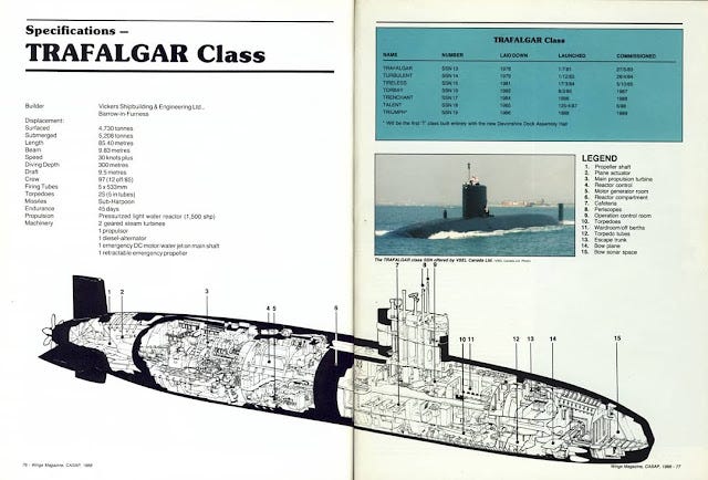 The Trafalgar-class nuclear submarine as proposed to Canada as part of our efforts to aquire nuclear submarines as outlined in 1987s Challenge and Commitment: A Defence Policy for Canada
