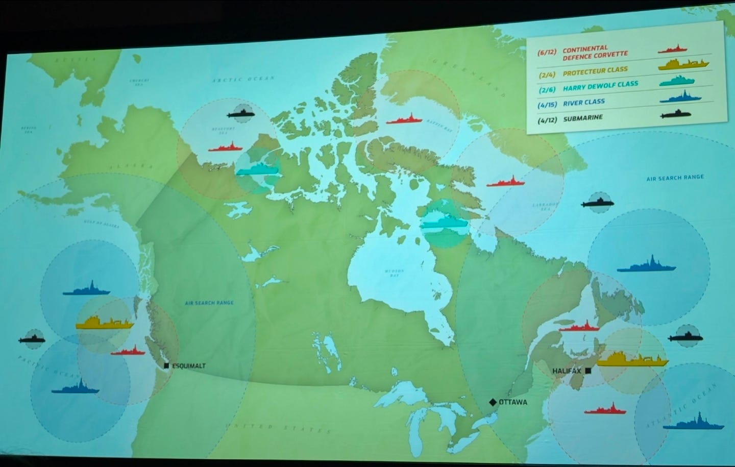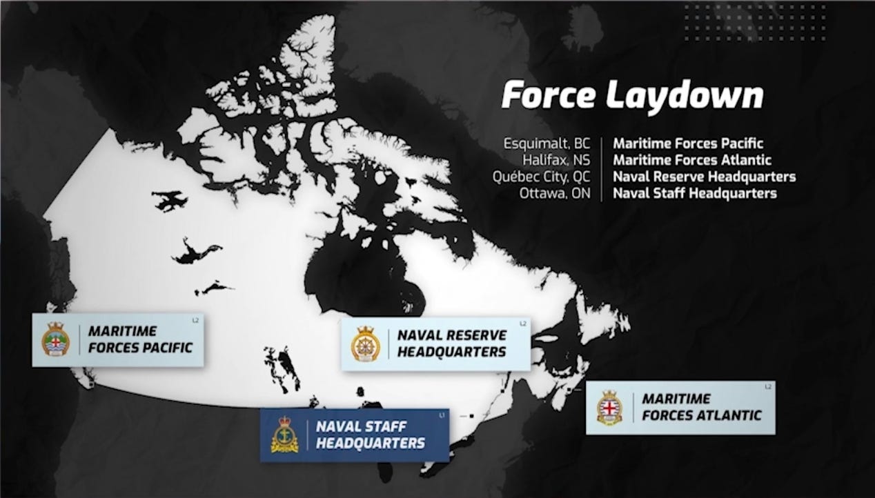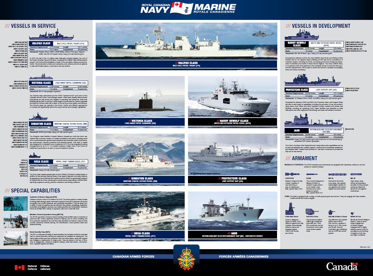 A map showcasing the future proposed fleet for the RCN, as well as the look at what the navy views as the desired number of vessels at sea at any given time to ensure comprehensive coverage of Canada’s Maritime Domain