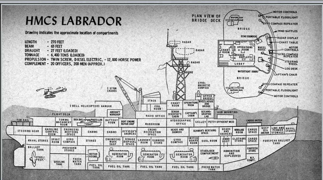Infographic for HMCS Labrador, the RCNs first Icebreaker. Later known as CGS Labrador and then CCGS Labrador