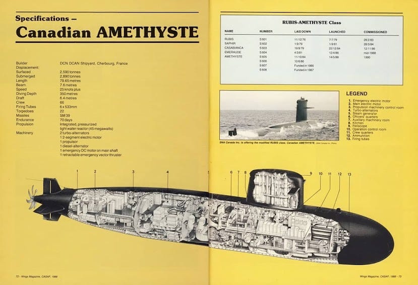 The Amethyste! A modified Rubis-class nuclear submarine as proposed to Canada as part of our efforts to aquire nuclear submarines as outlined in 1987s Challenge and Commitment: A Defence Polic for Canada