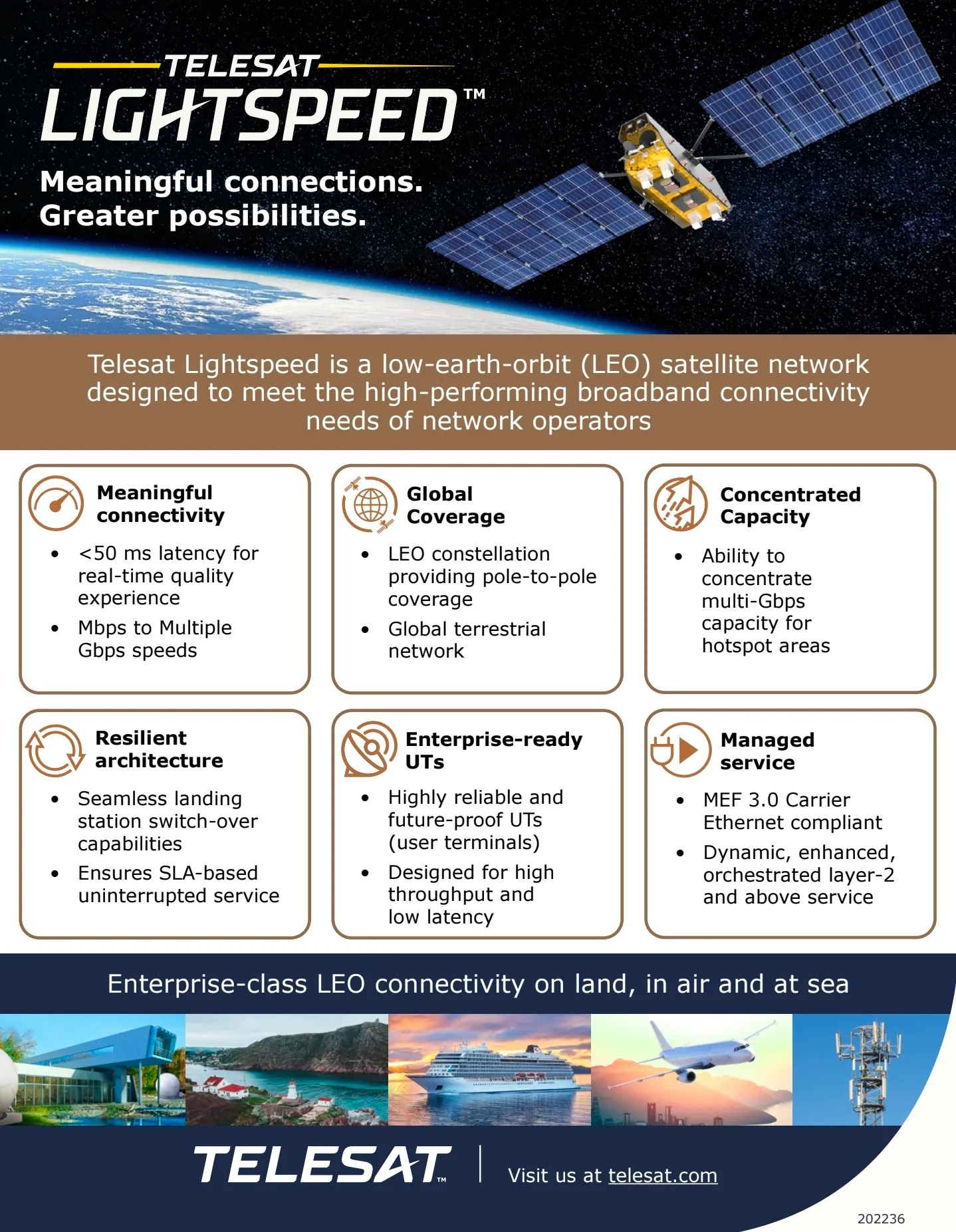 To remind everyone who might not know: Lightspeed is Telesat's newest enterprise-class, high-throughput LEO constellation. Lightspeed is a fully regenerative space-based mesh network that delivers fiber-like latency and multi-gigabit throughput to any point on Earth, including polar regions, while maintaining MEF 3.0 Carrier Ethernet standards.