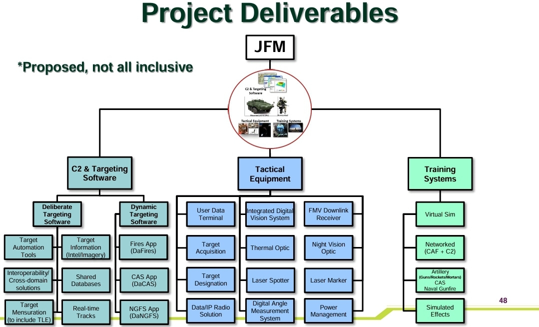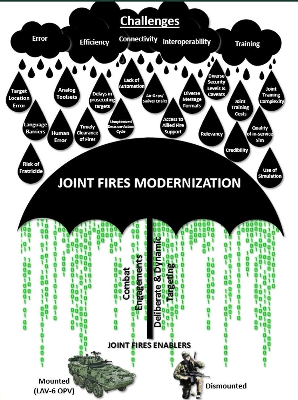 The Joint Fires Modernization (JFM) project focuses on digitizing the Joint Fires process, allowing for real-time sharing of a common operating picture. This will integrate tactical, operational, and strategic fires data across the Army, Navy, and Air Force, as well as coalition partners.